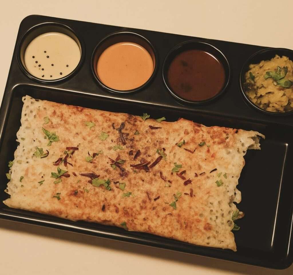 Rava dosa filled with spiced potato masala served with Sambhar and Chutneys